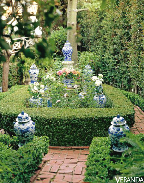 blue and white porcelain in their front garden bed.